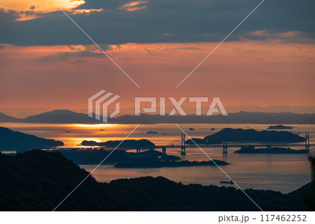 香川県 青ノ山から夕陽に照らされた瀬戸大橋を望む