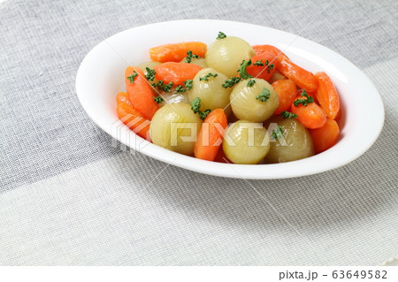 ニンジンとタマネギのグラッセ小皿盛り、野菜の煮物、白バック
