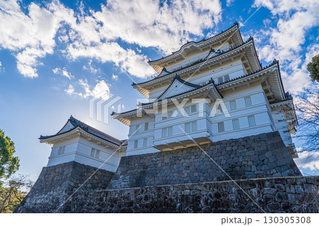【神奈川県】快晴の小田原城 天守閣と隅櫓と満開の桜