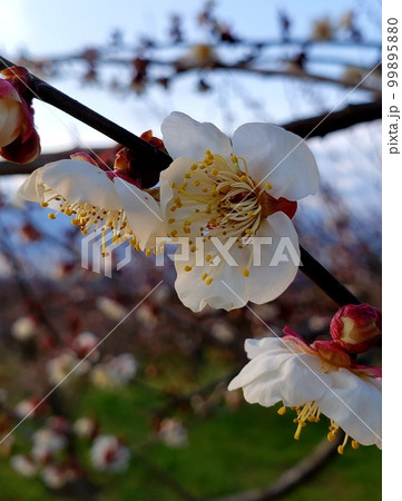 夕暮れの神奈川県小田原市の曽我梅林に咲く白梅【2月】