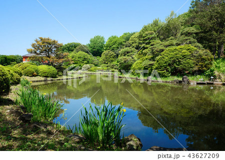 水辺の樹木の若葉に新緑と黄菖蒲 小石川植物園