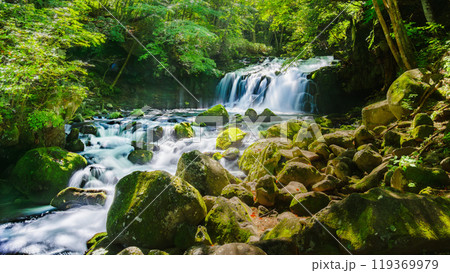 Tateshina-Otaki Falls in Nagano Prefecture, Japan, cascade over large stones and cliffs, blanketed in lush moss nourished by the cool mist rising from the falls.