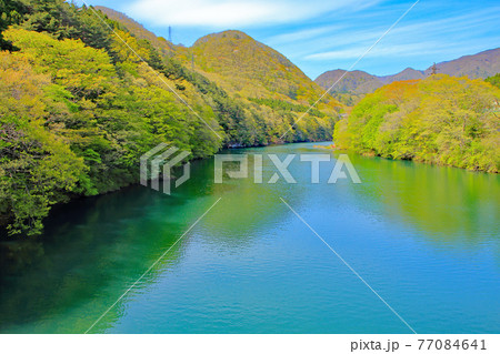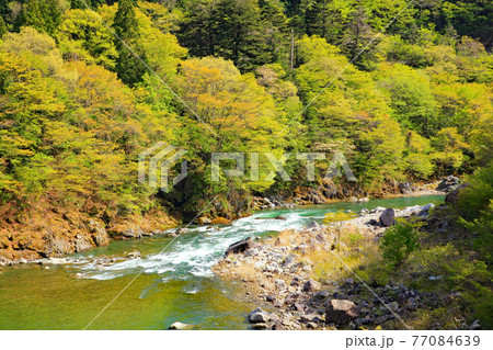 栃木県川治温泉 鬼怒川と新緑の山々