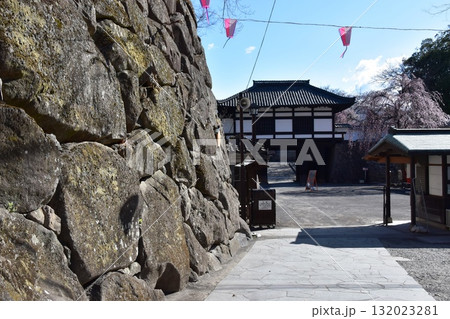 長野県 小諸城址懐古園の小諸城三の門と満開枝垂桜