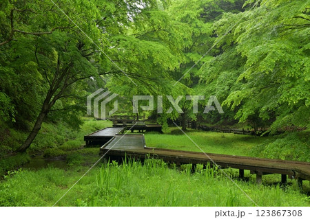 春雨に濡れる新緑のブナの森 只見町癒しの森 福島県