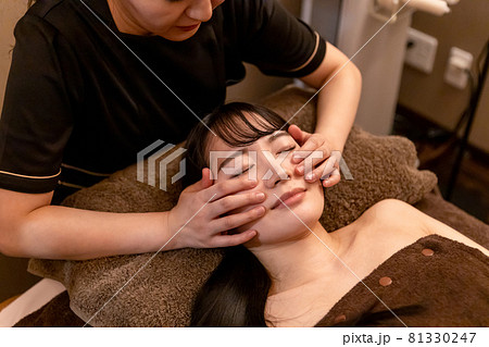 眉間・鼻筋のマッサージの施術を受けるアジア人女性とセラピスト