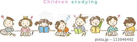 勉強する子供達の手描きイラスト