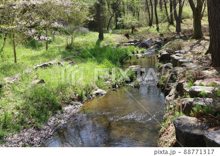 2021日本で一番幸せな町に選ばれた埼玉県鳩山町の農村公園内を流れる川辺に咲く花と緑が心を癒す風景