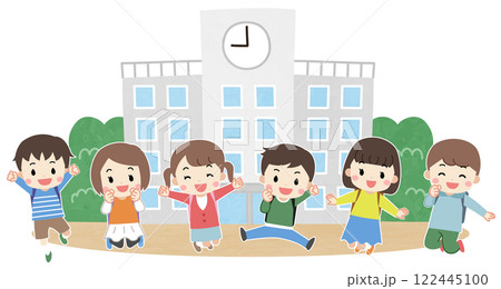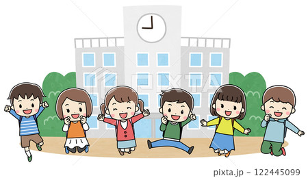 学校の前で笑顔でジャンプする供たちのイラスト
