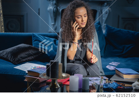 Modern beautiful soothsayer staring at her cellphone