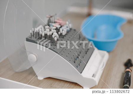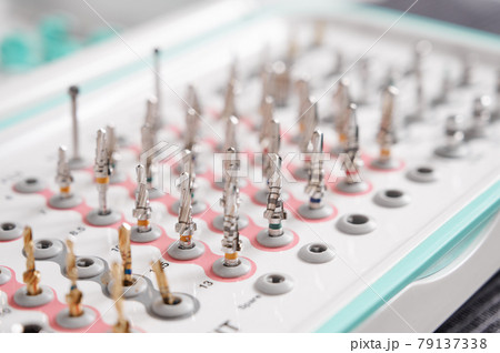 Set of drill nozzles for a dental bur machine for implants. Surgical taper kit. Macro, close up. Concept of contemporary dental technologies