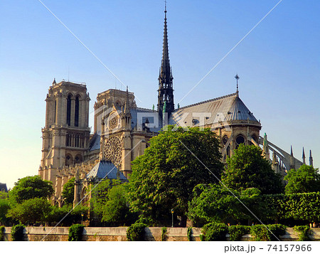 青空に尖塔が映える新緑の季節のノートルダム大聖堂