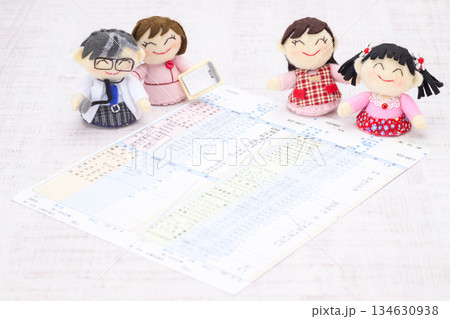 医師、看護師、母娘の人形と健康診断の結果の用紙