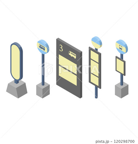 いろんなバス停留所の看板のセットイラスト、アイソメトリック構図。左面法。
