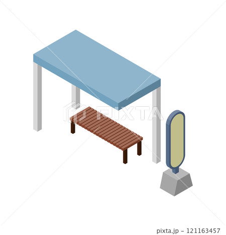 バス停にバスが止まっているアイソメトリックイラスト、右面法。主線なし。