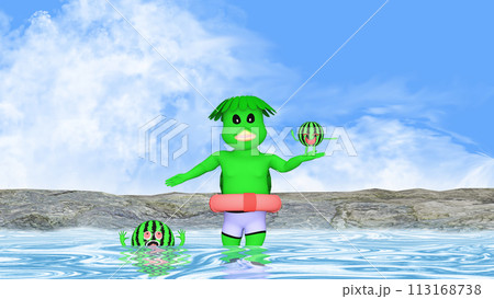 キュウリをくわえた河童小僧と溺れるスイカくん 文字入れ用素材