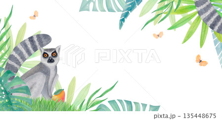 Watercolor tropical corner border with lemur, green jungle leaves and butterflies isolated on white. Exotic animal illustration.