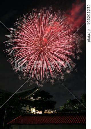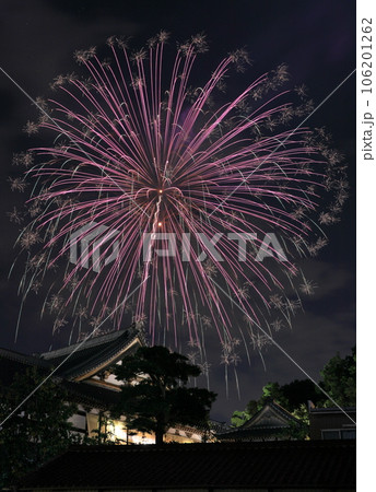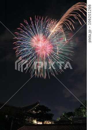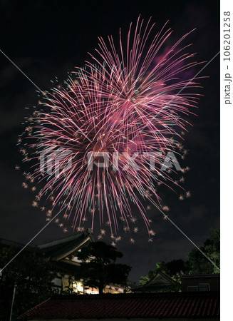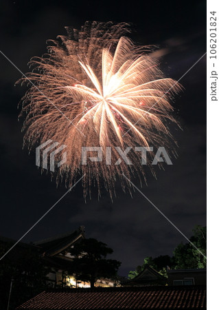 宝生寺の甍に降りそそぐ真っ赤なスターマイン