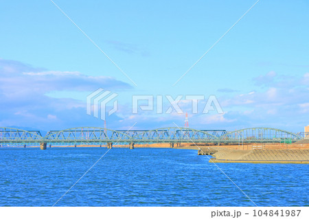 愛知県弥富市、木曽川に架かる鉄道橋の風景