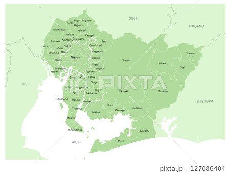 【英語】日本の愛知県の主な都市など地名付の地図(市町村や地域区分を線で描いている地図)