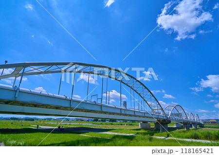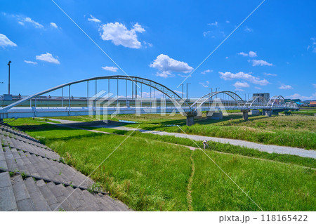 東京都稲城市押立の多目的広場付近の多摩川サイクリング道(歩道)から南東側の多摩川原橋方面
