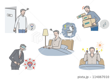 シニア男性の尿トラブル(尿漏れ・残尿感・夜間頻尿・膀胱炎)イラストセット