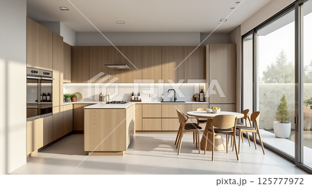Modern kitchen design with natural light and minimalist decor in a stylish dining area for home living