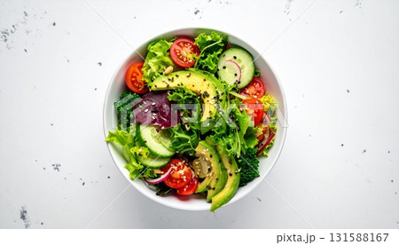 健康的なサラダボウル 白いテーブル上のトップダウンビュー