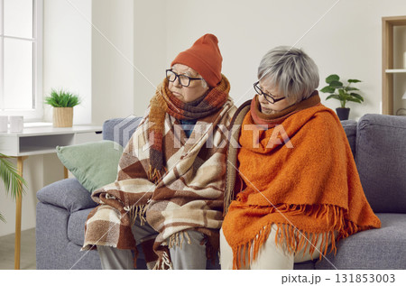 Portrait of a senior couple sitting wrapped in a blanket trying to warm up