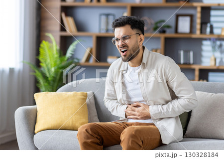 Young man in casual clothes sitting on comfortable sofa holding stomach in pain expression. Facial expression shows discomfort and distress. I