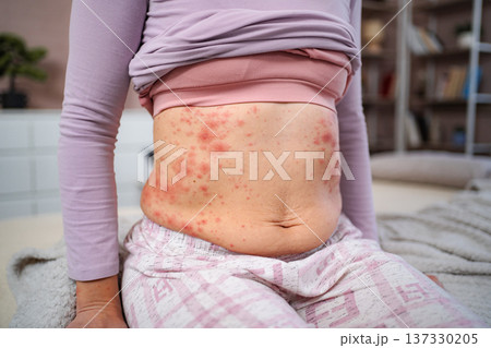 Woman's abdomen showing red rash, skin irritation, and allergy symptoms