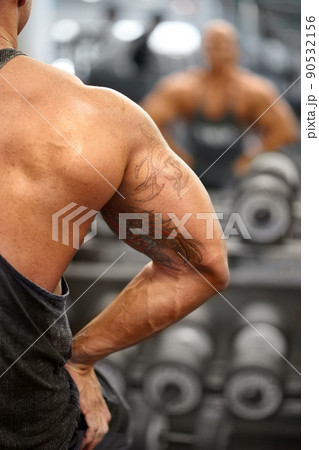 He is ripped. A muscular bodybuilder flexing his muscles while watching his reflection in the mirror.