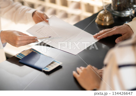 Airline attendant female hand holding airline boarding ticket in front of blurred woman passenger at airport check in counter