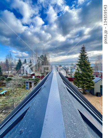 This beautifully crafted roof features modern shingles with a striking chimney, perfectly situated under a serene afternoon sky, enhancing the home's aesthetic