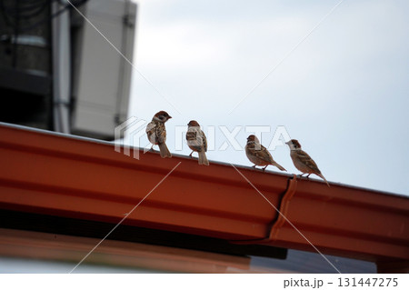 Sparrows sitting side by side on the eaves under a cloudy sky