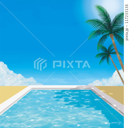 プールと青空とヤシの木水彩