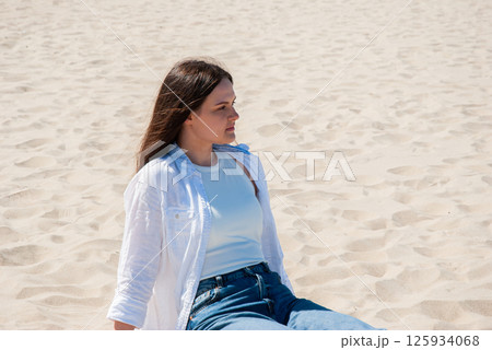 Young caucasian female enjoying a sunny day at the beach in casual attire including a white shirt and jeans, sitting relaxed on the sandy shore. Digital nomad lifestyle. Remote work