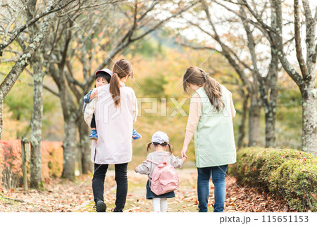 秋の公園を散歩・遠足する保育士の女性と園児(保育園・幼稚園保母)