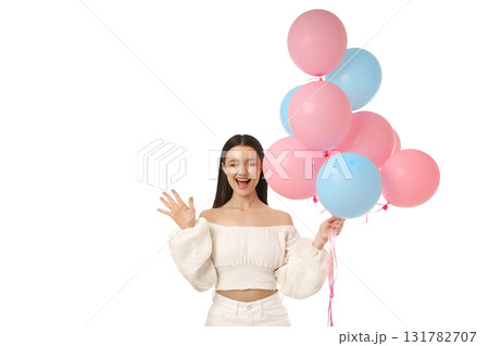 Woman waves with pink and blue balloons, isolated on white, PNG