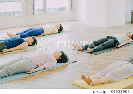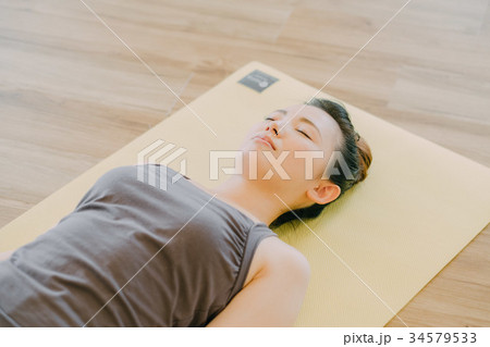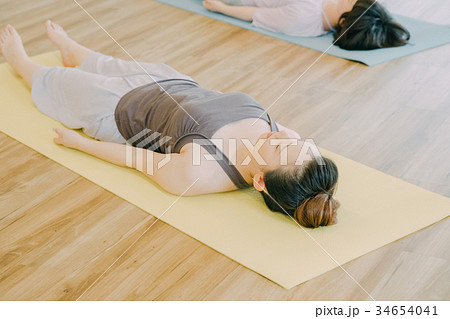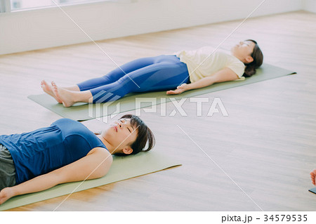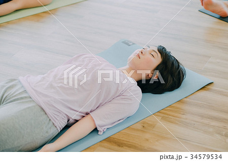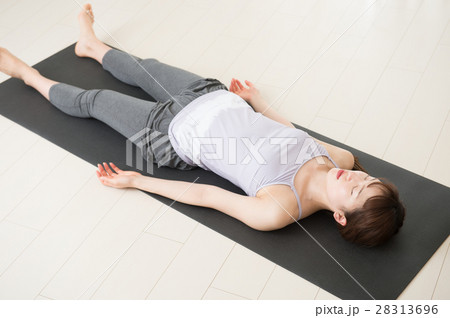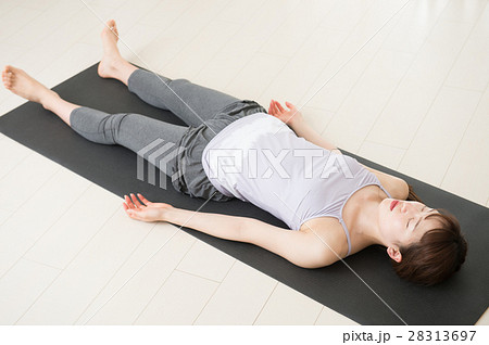 ヨガスタジオでヨガをする女性・シャバアーサナ