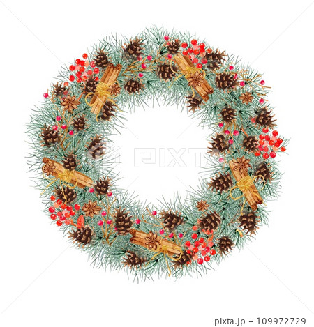 Christmas wreath isolated on white background. 2024. Clipart. Watercolor hand drawn art illustration. For cards, handmade textiles, prints, menus, poster