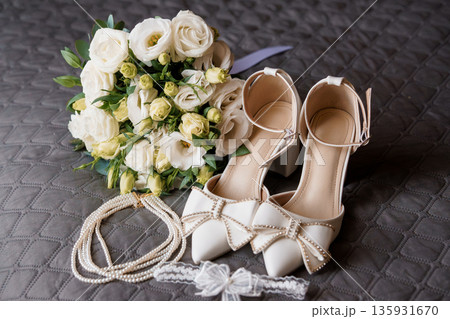 Elegant White Wedding Bouquet with Pearl Necklace and Bow-Adorned Bridal Shoes on Quilted Gray Background