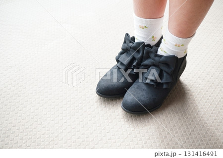 黒い大きなリボン付きショートブーツをクローズアップで撮影した可愛い足元のおしゃれ写真素材