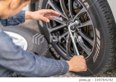 タイヤ交換 スタッドレスタイヤ 十字レンチ メカニック 素手