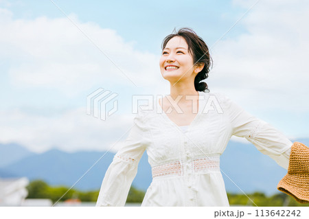 夏休み・GWに避暑地・リゾート地・田舎・地方に旅行に来た女性(リフレッシュ・バカンス・ストレス解消)