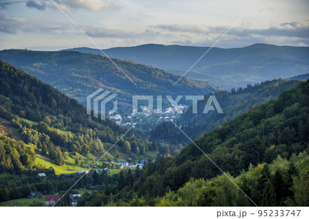 Landscape with mountains covered with green forest. Mountain panorama