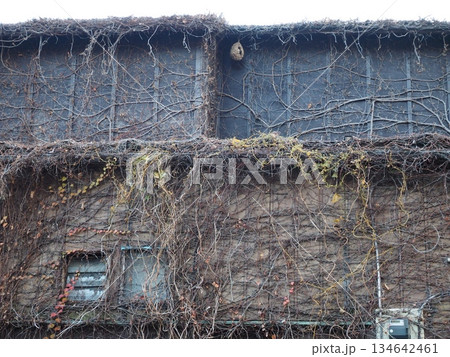 枯れた蔦が絡まる古い建物の壁と装飾窓、大田区山王のノスタルジックな風景