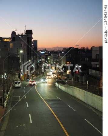 大田区・山王のジャーマン通り、夕暮れ時の街灯と車のライトが美しい都市風景