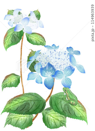 青色の山アジサイ葉の上で花を見つめる蛙のイラスト