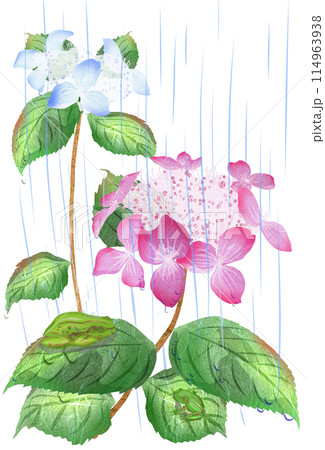 雨降りの山アジサイと二匹のアマガエルイラスト